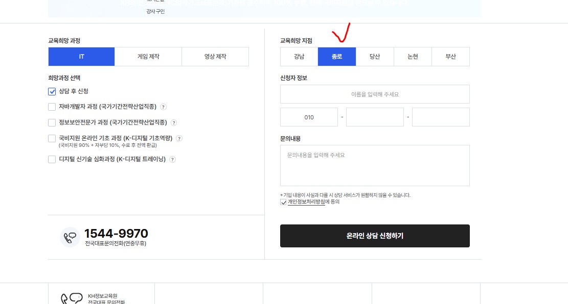 - 필수항목 : 이름, 연락처, 희망지점, 희망전공, 방문일자